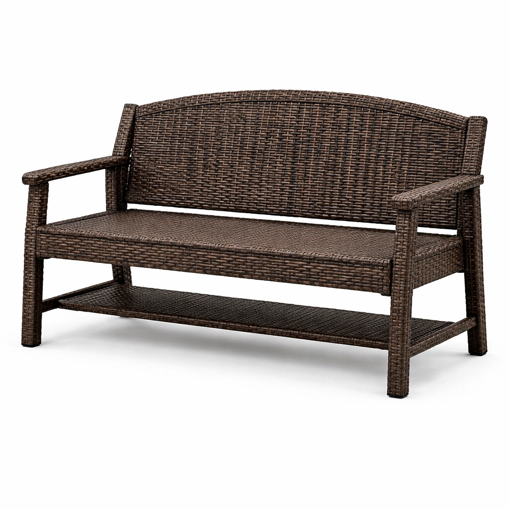 Banco de jardín fabricado en ratán sintético resistente a la intemperie con estructura de acero.