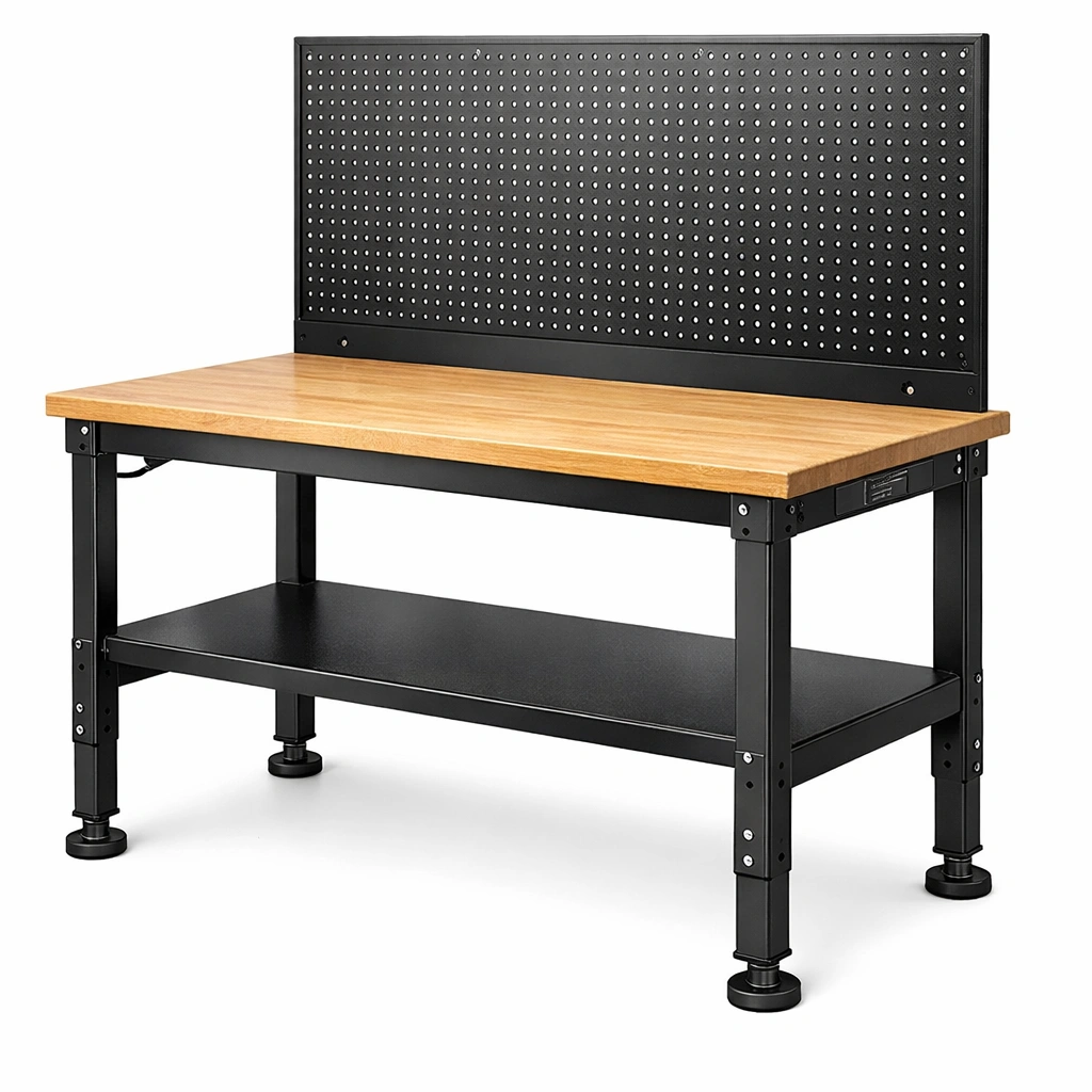 La mesa de trabajo está compuesta por una estructura metálica con un panel trasero perforado de acero pintado. La superficie está hecha de madera de roble macizo.