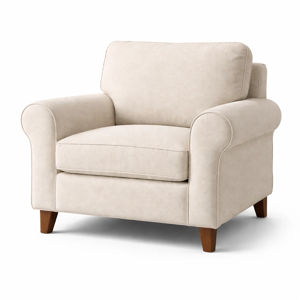 El sillón tiene un armazón de madera maciza. El tejido exterior es de lino beige. Los cojines están rellenos de espuma de alta densidad. Las patas son de madera maciza.