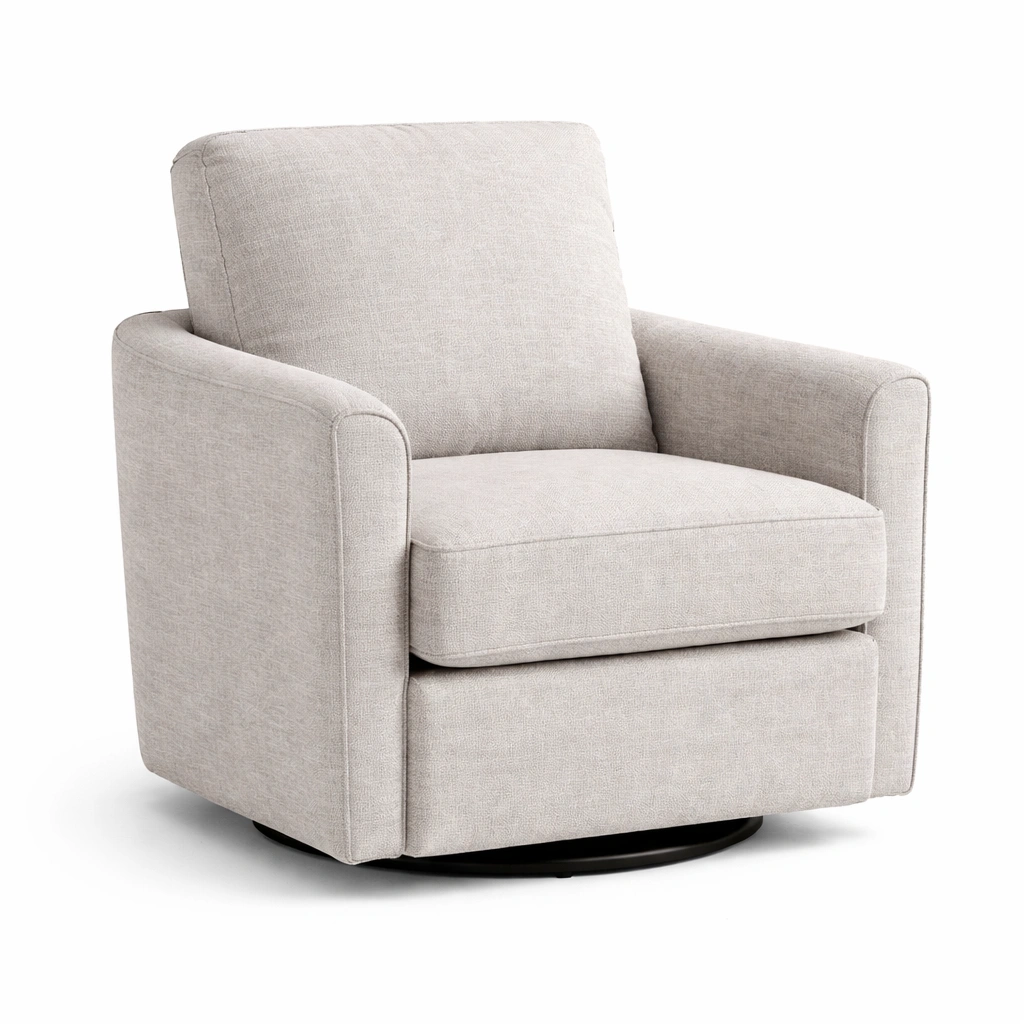 Este sillón tiene una estructura de madera con tapizado de tela 100% poliéster. La base es metálica y proporciona un mecanismo giratorio estable.